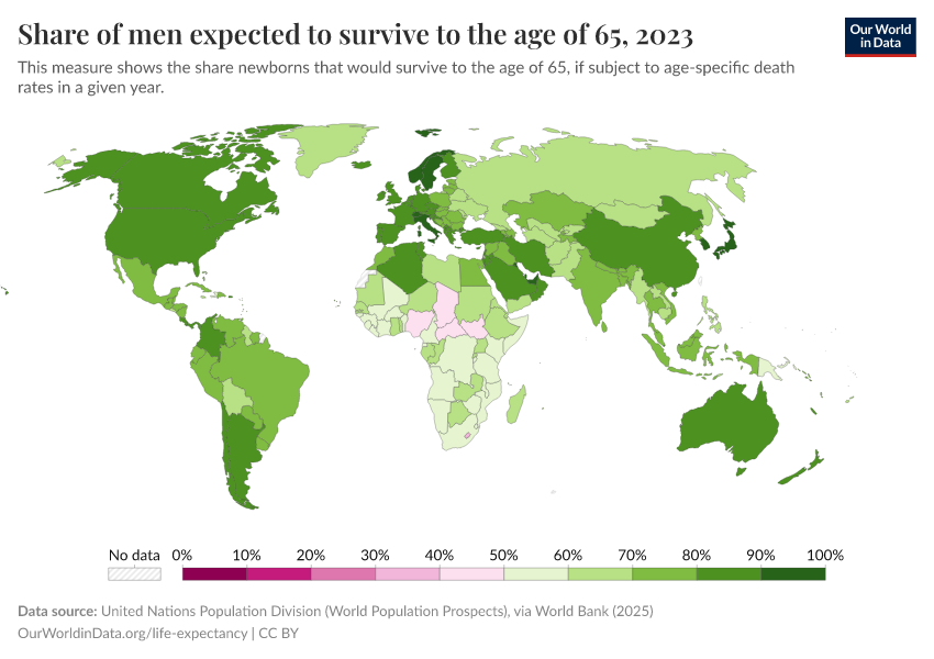 “Data Page: Share of men expected to survive to the age of 65”. Our World in Data (2025). Data adapted from United Nations Population Division (World Population Prospects), via World Bank. Retrieved from https://auto-epoch.owid.pages.dev:8789/20250916-102301/grapher/men-survival-to-age-65.html [online resource] (archived on September 16, 2025).How to cite this data