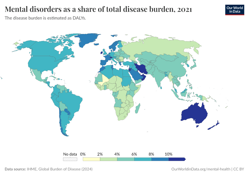 IHME, Global Burden of Disease (2024) – with minor processing by Our World in Data. “Mental disorders as a share of total disease burden” [dataset]. IHME, Global Burden of Disease, “Global Burden of Disease - Deaths and DALYs” [original data]. Retrieved November 2, 2025 from https://auto-epoch.owid.pages.dev:8789/20250909-093708/grapher/mental-and-substance-use-as-share-of-disease.html (archived on September 9, 2025).