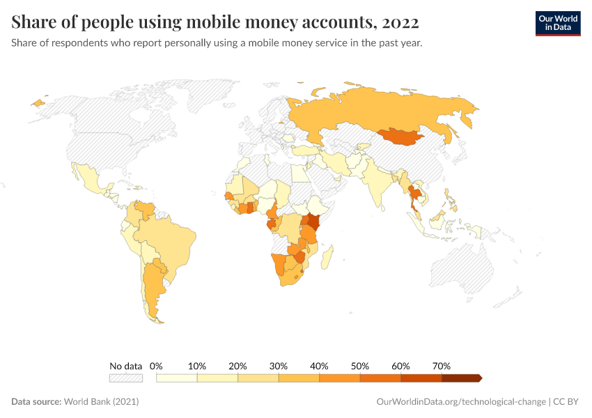 “Data Page: Share of people using mobile money accounts”, part of the following publication: Max Roser, Bertha Rohenkohl, Pablo Arriagada, Joe Hasell, Hannah Ritchie, and Esteban Ortiz-Ospina (2023) - “Economic Growth”. Data adapted from World Bank. Retrieved from https://auto-epoch.owid.pages.dev:8789/20250909-093708/grapher/mobile-money-account-usage.html [online resource] (archived on September 9, 2025).How to cite this data