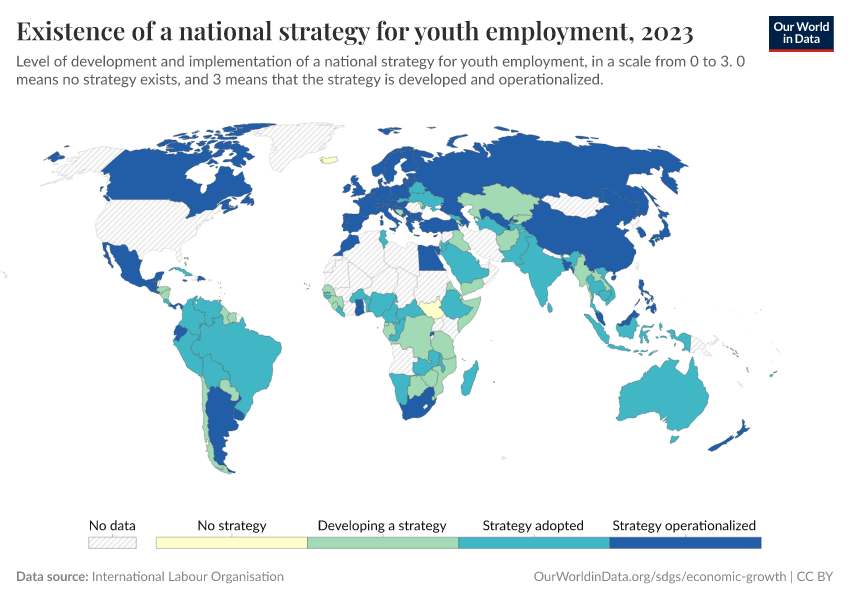 International Labour Organisation – with minor processing by Our World in Data. “Existence of a national strategy for youth employment” [dataset]. International Labour Organisation, “ILO estimates based on information collected directly from national governments.” [original data]. Retrieved November 1, 2025 from https://auto-epoch.owid.pages.dev:8789/20250923-151844/grapher/national-strategy-for-youth-employment.html (archived on September 23, 2025).