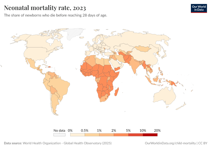 World Health Organization - Global Health Observatory (2025) – processed by Our World in Data. “Neonatal mortality rate” [dataset]. World Health Organization, “Global Health Observatory” [original data]. Retrieved November 1, 2025 from https://auto-epoch.owid.pages.dev:8789/20250909-093708/grapher/neonatal-mortality-rate-gho.html (archived on September 9, 2025).