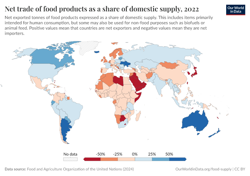 “Data Page: Net trade of food products as a share of domestic supply”, part of the following publication: Hannah Ritchie, Pablo Rosado, and Max Roser (2023) - “Agricultural Production”. Data adapted from Food and Agriculture Organization of the United Nations. Retrieved from https://auto-epoch.owid.pages.dev:8789/20250909-093708/grapher/net-food-trade-as-a-share-of-domestic-supply.html [online resource] (archived on September 9, 2025).How to cite this data