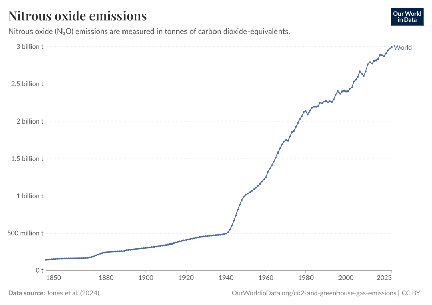 “Data Page: Annual nitrous oxide emissions including land use”, part of the following publication: Hannah Ritchie, Pablo Rosado, and Max Roser (2023) - “CO₂ and Greenhouse Gas Emissions”. Data adapted from Jones et al.. Retrieved from https://auto-epoch.owid.pages.dev:8789/20250909-093708/grapher/nitrous-oxide-emissions.html [online resource] (archived on September 9, 2025).How to cite this data