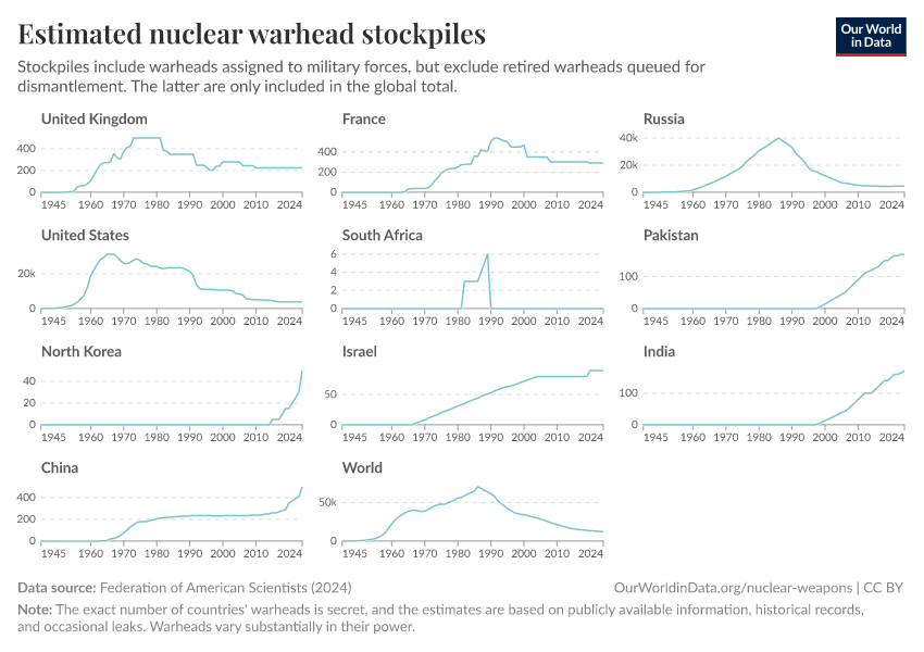 “Data Page: Estimated nuclear warhead stockpiles”, part of the following publication: Bastian Herre, Pablo Rosado, and Max Roser (2024) - “Nuclear Weapons”. Data adapted from Federation of American Scientists. Retrieved from https://auto-epoch.owid.pages.dev:8789/20250909-093708/grapher/nuclear-warhead-stockpiles-lines.html [online resource] (archived on September 9, 2025).