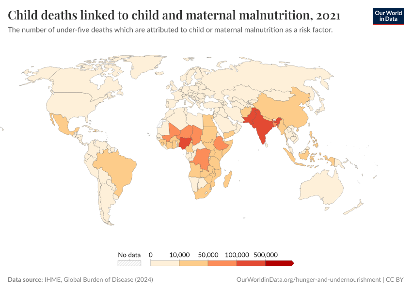 IHME, Global Burden of Disease (2024) – with minor processing by Our World in Data. “Child deaths linked to child and maternal malnutrition” [dataset]. IHME, Global Burden of Disease, “Global Burden of Disease - Risk Factors” [original data]. Retrieved November 1, 2025 from https://auto-epoch.owid.pages.dev:8789/20250909-093708/grapher/number-child-deaths-malnutrition.html (archived on September 9, 2025).