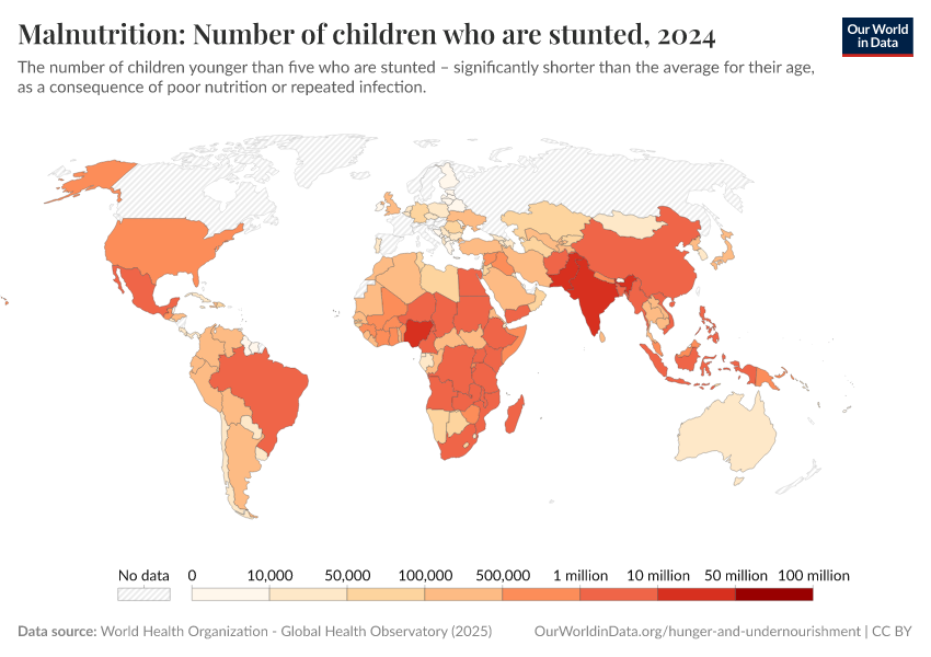 “Data Page: Malnutrition: Number of children who are stunted”. Our World in Data (2025). Data adapted from World Health Organization. Retrieved from https://auto-epoch.owid.pages.dev:8789/20250909-093708/grapher/number-children-stunted-who.html [online resource] (archived on September 9, 2025).How to cite this data