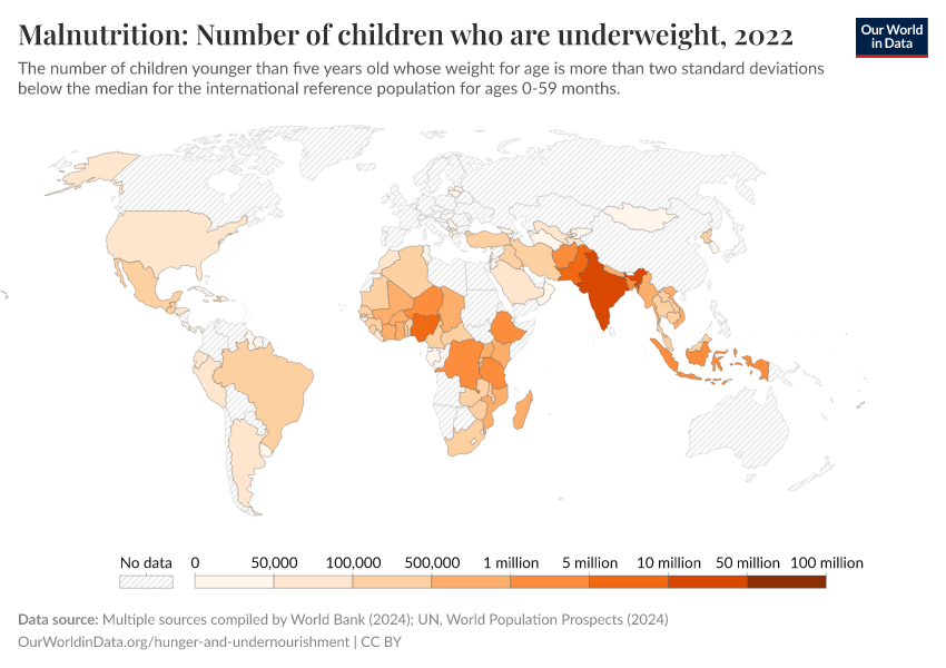 “Data Page: Number of underweight children”. Our World in Data (2025). Data adapted from UNICEF, WHO, World Bank, United Nations. Retrieved from https://auto-epoch.owid.pages.dev:8789/20250929-104429/grapher/number-of-children-who-are-underweight.html [online resource] (archived on September 29, 2025).How to cite this data