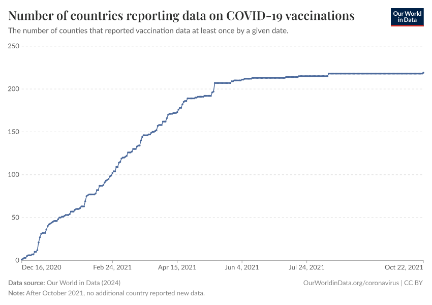 Our World in Data (2024) – processed by Our World in Data. “Number of countries reporting data on COVID-19 vaccinations” [dataset]. Our World in Data, “GitHub stats on owid/covid-19-data repository” [original data]. Retrieved November 1, 2025 from https://auto-epoch.owid.pages.dev:8789/20250909-093708/grapher/number-of-countries-reporting-data-on-vaccinations.html (archived on September 9, 2025).