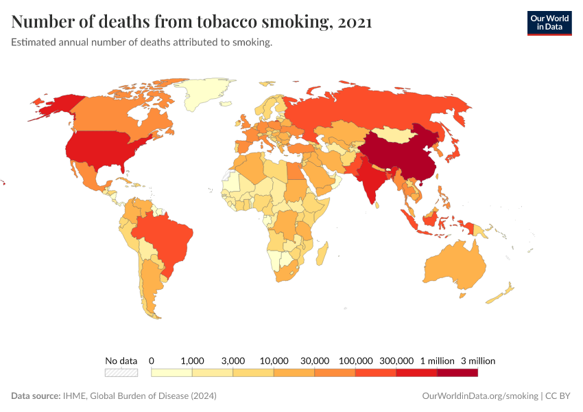 “Data Page: Number of deaths from tobacco smoking”, part of the following publication: Esteban Ortiz-Ospina and Max Roser (2016) - “Global Health”. Data adapted from IHME, Global Burden of Disease. Retrieved from https://auto-epoch.owid.pages.dev:8789/20250909-093708/grapher/number-of-deaths-from-tobacco-smoking.html [online resource] (archived on September 9, 2025).How to cite this data