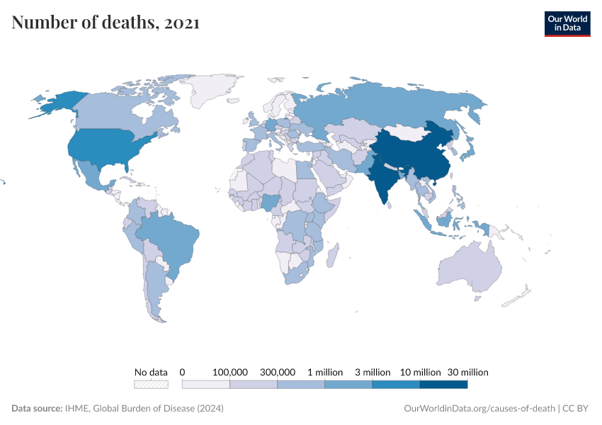 IHME, Global Burden of Disease (2024) – with minor processing by Our World in Data. “Number of deaths” [dataset]. IHME, Global Burden of Disease, “Global Burden of Disease - Deaths and DALYs” [original data]. Retrieved November 1, 2025 from https://auto-epoch.owid.pages.dev:8789/20250909-093708/grapher/number-of-deaths-gbd.html (archived on September 9, 2025).