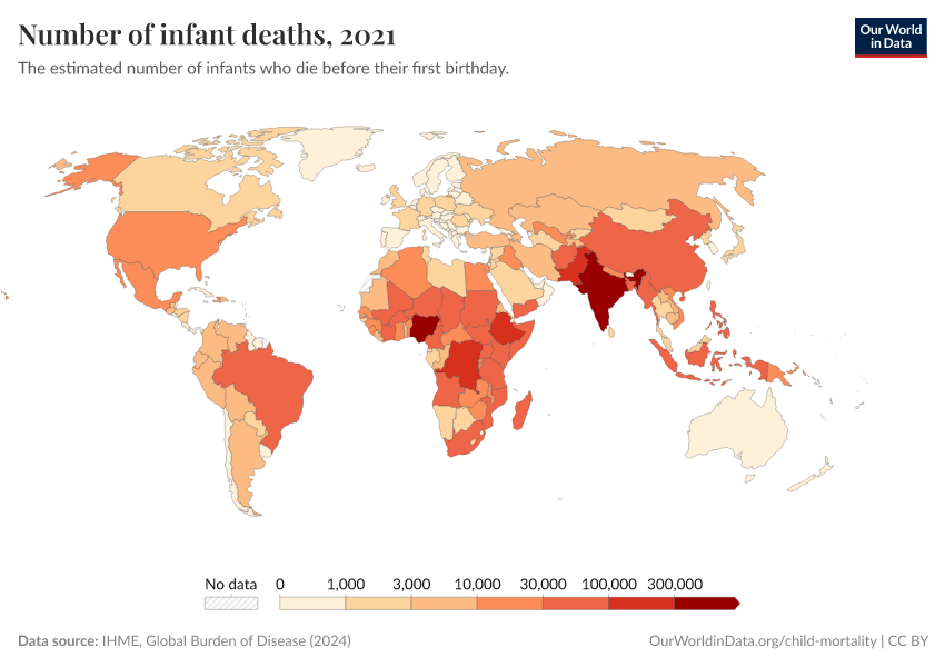 IHME, Global Burden of Disease (2024) – with minor processing by Our World in Data. “Number of infant deaths” [dataset]. IHME, Global Burden of Disease, “Global Burden of Disease - Child Mortality” [original data]. Retrieved November 1, 2025 from https://auto-epoch.owid.pages.dev:8789/20250909-093708/grapher/number-of-infant-deaths-ihme.html (archived on September 9, 2025).
