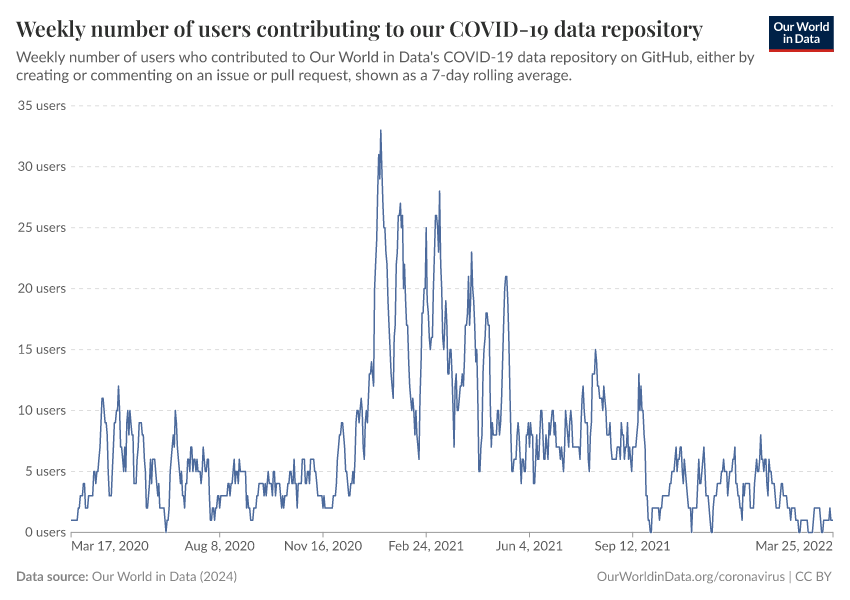 Our World in Data (2024) – processed by Our World in Data. “Weekly number of users contributing to our COVID-19 data repository” [dataset]. Our World in Data, “GitHub stats on owid/covid-19-data repository” [original data]. Retrieved November 1, 2025 from https://auto-epoch.owid.pages.dev:8789/20250909-093708/grapher/number-of-users-participating-issue-or-pull-request-owid-covid-repository.html (archived on September 9, 2025).