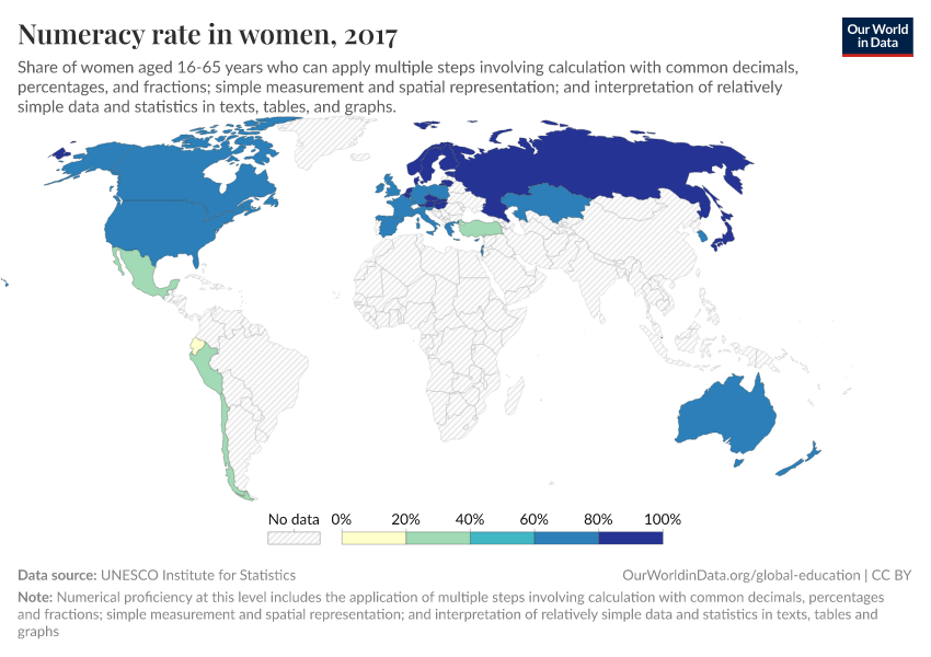 “Data Page: Numeracy rate in women”. Our World in Data (2025). Data adapted from UNESCO Institute for Statistics. Retrieved from https://auto-epoch.owid.pages.dev:8789/20250909-093708/grapher/numeracy-rate-in-adult-women-sdg.html [online resource] (archived on September 9, 2025).How to cite this data