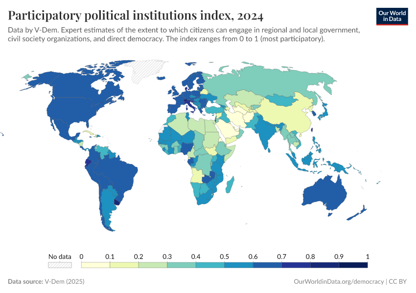 “Data Page: Participatory political institutions”, part of the following publication: Bastian Herre, Lucas Rodés-Guirao, and Esteban Ortiz-Ospina (2013) - “Democracy”. Data adapted from V-Dem. Retrieved from https://auto-epoch.owid.pages.dev:8789/20250925-233948/grapher/participatory-political-institutions-index.html [online resource] (archived on September 25, 2025).How to cite this data