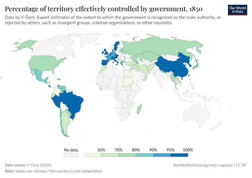 “Data Page: Territory under state control”, part of the following publication: Bastian Herre, Lucas Rodés-Guirao, and Esteban Ortiz-Ospina (2013) - “Democracy”. Data adapted from V-Dem. Retrieved from https://auto-epoch.owid.pages.dev:8789/20250925-233948/grapher/percentage-of-territory-controlled-by-government.html [online resource] (archived on September 25, 2025).How to cite this data