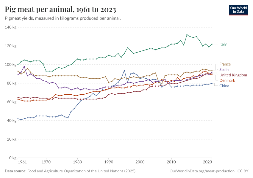 “Data Page: Pig meat yield per animal”, part of the following publication: Hannah Ritchie, Pablo Rosado, and Max Roser (2023) - “Agricultural Production”. Data adapted from Food and Agriculture Organization of the United Nations. Retrieved from https://auto-epoch.owid.pages.dev:8789/20250909-093708/grapher/pig-yields-meat-per-animal-in-hectograms-100-grams.html [online resource] (archived on September 9, 2025).How to cite this data