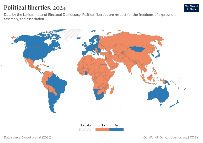 Skaaning et al. (2025) – processed by Our World in Data. “Political liberties” [dataset]. Skaaning et al., “Lexical Index of Electoral Democracy (LIED) v6.8” [original data]. Retrieved November 1, 2025 from https://auto-epoch.owid.pages.dev:8789/20250909-093708/grapher/political-liberties-lexical.html (archived on September 9, 2025).