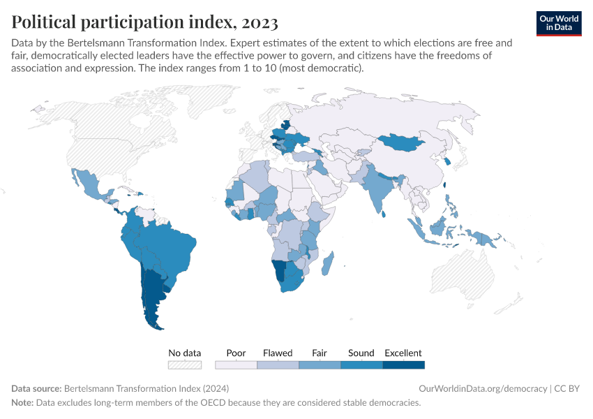 “Data Page: Political participation index”, part of the following publication: Bastian Herre, Lucas Rodés-Guirao, and Esteban Ortiz-Ospina (2013) - “Democracy”. Data adapted from Bertelsmann Transformation Index. Retrieved from https://auto-epoch.owid.pages.dev:8789/20250909-093708/grapher/political-participation-index-bti.html [online resource] (archived on September 9, 2025).How to cite this data