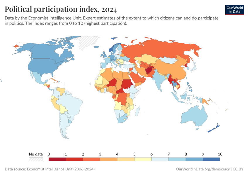 Economist Intelligence Unit (2006-2024) – processed by Our World in Data. “Political participation index” [dataset]. Economist Intelligence Unit, “Democracy Index 2021: The China challenge”; Economist Intelligence Unit, “Democracy Index 2022: Frontline democracy and the battle for Ukraine”; Economist Intelligence Unit, “Democracy Index 2023: Age of Conflict”; Economist Intelligence Unit, “Democracy Index 2024: What's wrong with representative democracy?”; Gapminder, “Democracy Index v4”; Various sources, “Population” [original data]. Retrieved November 1, 2025 from https://auto-epoch.owid.pages.dev:8789/20250925-233948/grapher/political-participation-index-eiu.html (archived on September 25, 2025).