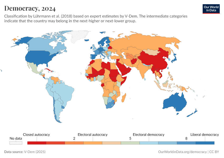 “Data Page: Political regime”, part of the following publication: Bastian Herre, Lucas Rodés-Guirao, and Esteban Ortiz-Ospina (2013) - “Democracy”. Data adapted from V-Dem. Retrieved from https://auto-epoch.owid.pages.dev:8789/20250909-093708/grapher/political-regime-amb-row.html [online resource] (archived on September 9, 2025).How to cite this data