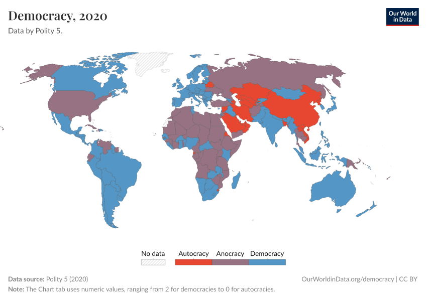 Polity 5 (2020) – processed by Our World in Data. “Democracy” [dataset]. Polity 5, “Polity5 Project, Political Regime Characteristics and Transitions, 1800-2018 5” [original data]. Retrieved November 1, 2025 from https://auto-epoch.owid.pages.dev:8789/20250909-093708/grapher/political-regime-polity.html (archived on September 9, 2025).