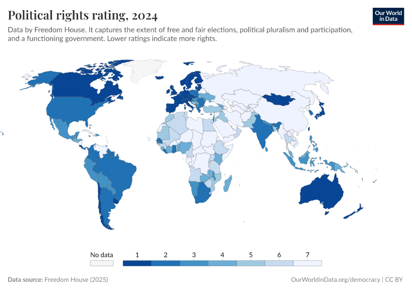 Freedom House (2025) – processed by Our World in Data. “Political rights rating” [dataset]. Freedom House, “Freedom in the World” [original data]. Retrieved November 1, 2025 from https://auto-epoch.owid.pages.dev:8789/20250909-093708/grapher/political-rights-rating-fh.html (archived on September 9, 2025).