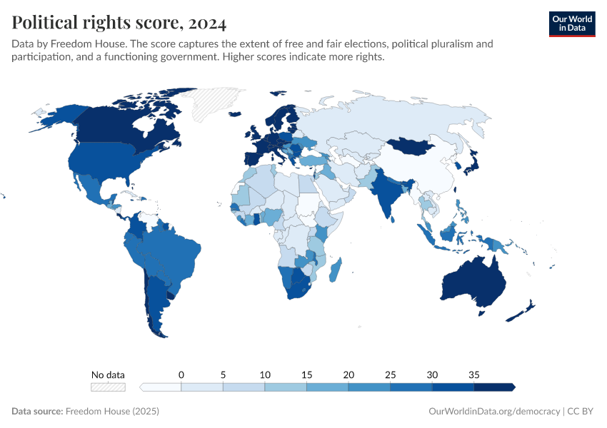 Freedom House (2025) – processed by Our World in Data. “Political rights score” [dataset]. Freedom House, “Freedom in the World” [original data]. Retrieved November 1, 2025 from https://auto-epoch.owid.pages.dev:8789/20250909-093708/grapher/political-rights-score-fh.html (archived on September 9, 2025).
