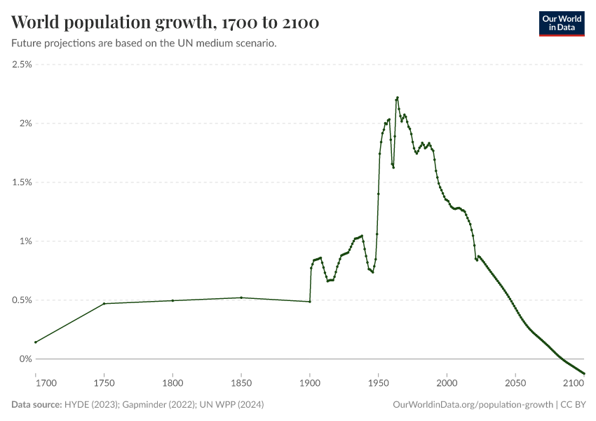 “Data Page: World population growth”, part of the following publication: Hannah Ritchie, Lucas Rodés-Guirao, Edouard Mathieu, Marcel Gerber, Esteban Ortiz-Ospina, Joe Hasell, and Max Roser (2023) - “Population Growth”. Data adapted from PBL Netherlands Environmental Assessment Agency, Gapminder, United Nations. Retrieved from https://auto-epoch.owid.pages.dev:8789/20250929-103213/grapher/population-growth-rate.html [online resource] (archived on September 29, 2025).How to cite this data