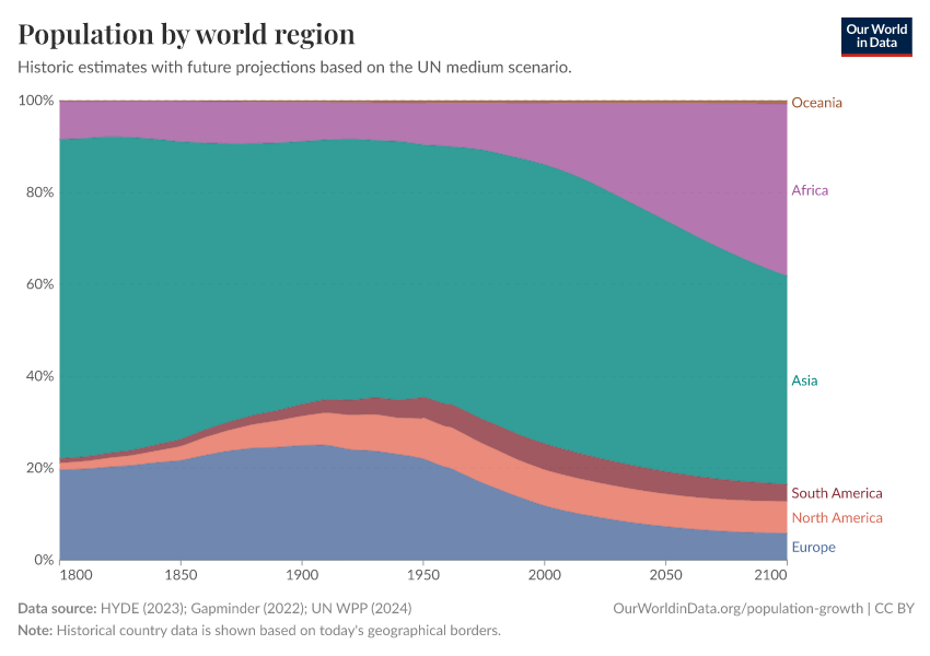 HYDE (2023); Gapminder (2022); UN WPP (2024) – with major processing by Our World in Data. “Population by world region” [dataset]. PBL Netherlands Environmental Assessment Agency, “History Database of the Global Environment 3.3”; Gapminder, “Population v7”; United Nations, “World Population Prospects”; Gapminder, “Systema Globalis” [original data]. Retrieved November 1, 2025 from https://auto-epoch.owid.pages.dev:8789/20250929-103213/grapher/population-regions-with-projections.html (archived on September 29, 2025).