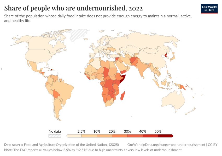 - Many countries, especially high-income ones, are shown at 2.5% because the FAO reports values between 0% and 2.5% as "<2.5%", due to uncertainty at very low levels of undernourishment.