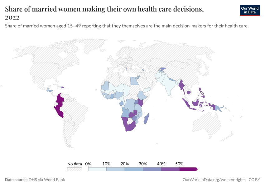 DHS via World Bank – processed by Our World in Data. “Share of married women making their own health care decisions” [dataset]. World Bank Gender Statistics, “World Bank Gender Statistics” [original data]. Retrieved November 1, 2025 from https://auto-epoch.owid.pages.dev:8789/20250916-204433/grapher/proportion-of-women-who-make-their-own-informed-health-care-decisions.html (archived on September 16, 2025).