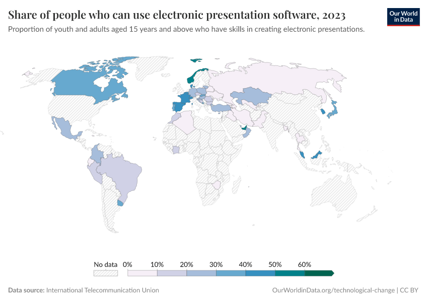 International Telecommunication Union – processed by Our World in Data. “Share of people who can use electronic presentation software” [dataset]. International Telecommunication Union, “Data from multiple sources” [original data]. Retrieved November 1, 2025 from https://auto-epoch.owid.pages.dev:8789/20250909-093708/grapher/proportion-with-ict-skills-in-presentations.html (archived on September 9, 2025).