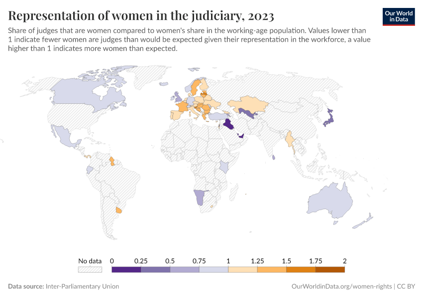 “Data Page: Representation of women in the judiciary”. Our World in Data (2025). Data adapted from Inter-Parliamentary Union. Retrieved from https://auto-epoch.owid.pages.dev:8789/20250909-093708/grapher/representation-of-women-in-the-judiciary.html [online resource] (archived on September 9, 2025).How to cite this data