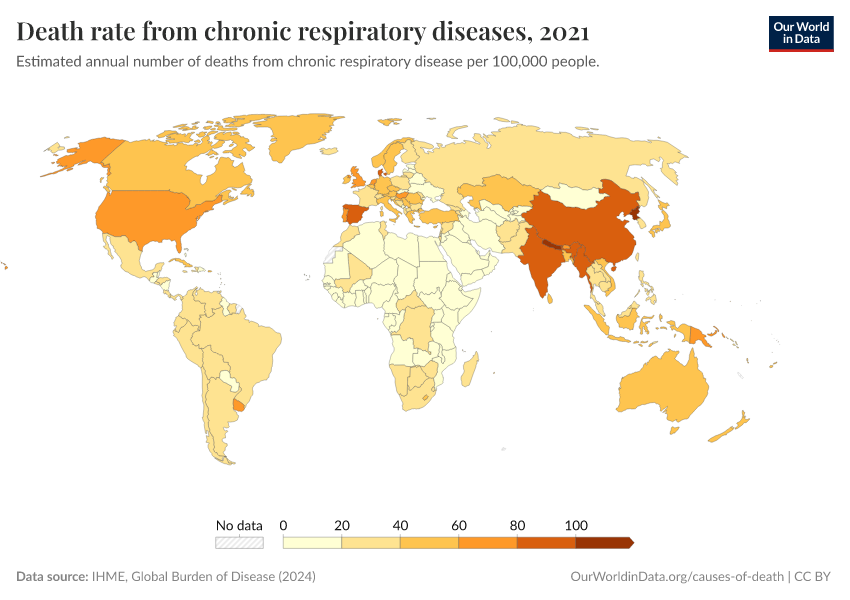 “Data Page: Death rate from chronic respiratory diseases”, part of the following publication: Esteban Ortiz-Ospina and Max Roser (2016) - “Global Health”. Data adapted from IHME, Global Burden of Disease. Retrieved from https://auto-epoch.owid.pages.dev:8789/20250909-093708/grapher/respiratory-disease-death-rate-gbd.html [online resource] (archived on September 9, 2025).How to cite this data