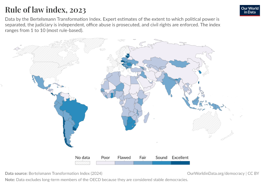 Bertelsmann Transformation Index (2024) – processed by Our World in Data. “Rule of law index” [dataset]. Bertelsmann Transformation Index, “Bertelsmann Transformation Index, Scores” [original data]. Retrieved November 1, 2025 from https://auto-epoch.owid.pages.dev:8789/20250909-093708/grapher/rule-of-law-index-bti.html (archived on September 9, 2025).