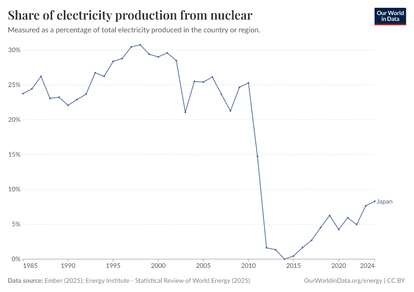 “Data Page: Share of electricity generated by nuclear power”, part of the following publication: Hannah Ritchie, Pablo Rosado, and Max Roser (2023) - “Energy”. Data adapted from Ember, Energy Institute. Retrieved from https://auto-epoch.owid.pages.dev:8789/20250909-093708/grapher/share-electricity-nuclear.html [online resource] (archived on September 9, 2025).How to cite this data