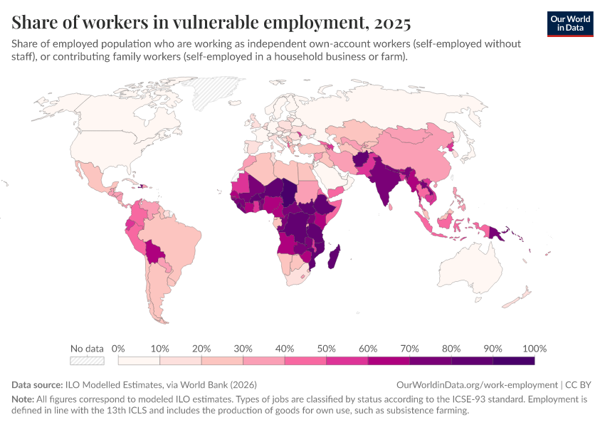 “Data Page: Share of workers in vulnerable employment”, part of the following publication: Bertha Rohenkohl, Pablo Arriagada, and Esteban Ortiz-Ospina (2026) - “Work and Employment”. Data adapted from ILO Modelled Estimates, via World Bank. Retrieved from https://auto-epoch.owid.pages.dev:8789/20260304-094028/grapher/share-in-vulnerable-employment.html [online resource] (archived on March 4, 2026).How to cite this data