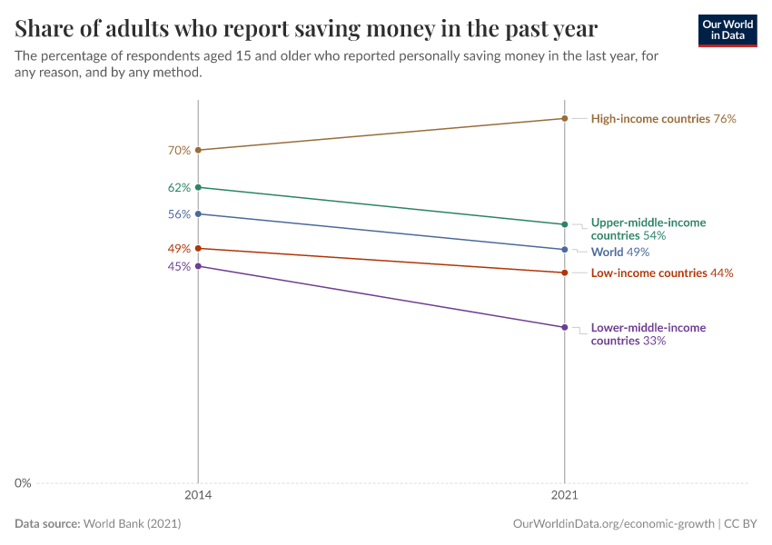 “Data Page: Share of adults who report saving money in the past year”, part of the following publication: Max Roser, Bertha Rohenkohl, Pablo Arriagada, Joe Hasell, Hannah Ritchie, and Esteban Ortiz-Ospina (2023) - “Economic Growth”. Data adapted from World Bank. Retrieved from https://auto-epoch.owid.pages.dev:8789/20250909-093708/grapher/share-of-adults-who-report-saving-money-in-the-past-year.html [online resource] (archived on September 9, 2025).How to cite this data