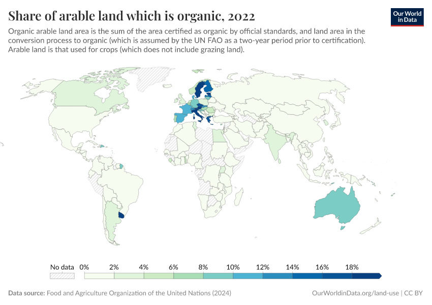 “Data Page: Share of arable land that is organic”, part of the following publication: Hannah Ritchie, Pablo Rosado, and Max Roser (2023) - “Agricultural Production”. Data adapted from Food and Agriculture Organization of the United Nations. Retrieved from https://auto-epoch.owid.pages.dev:8789/20250909-093708/grapher/share-of-arable-land-which-is-organic.html [online resource] (archived on September 9, 2025).How to cite this data