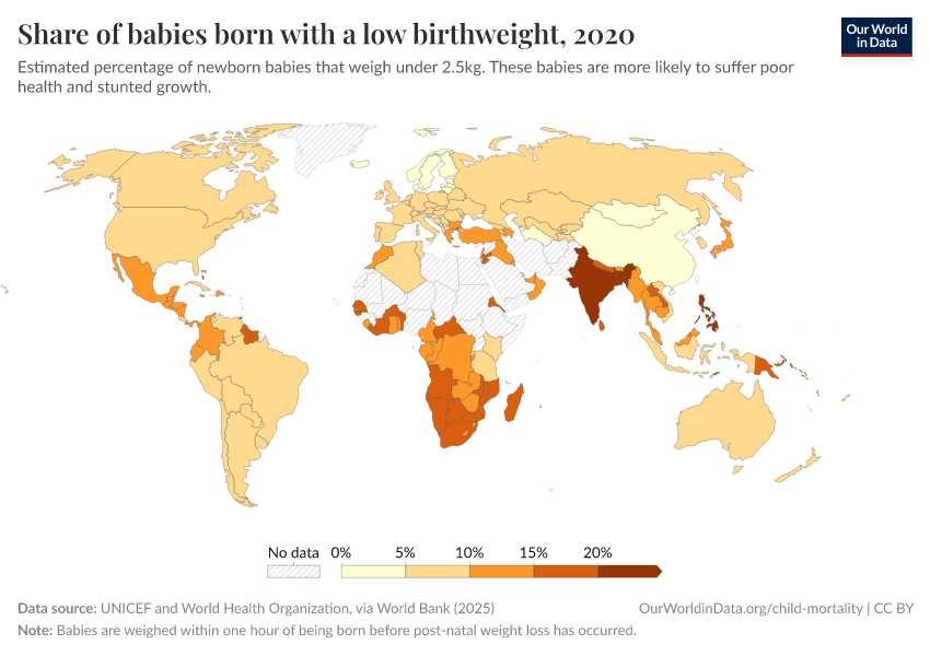 UNICEF and World Health Organization, via World Bank (2025) – processed by Our World in Data. “Share of babies born with a low birthweight” [dataset]. UNICEF and World Health Organization, via World Bank, “World Development Indicators 122” [original data]. Retrieved November 1, 2025 from https://auto-epoch.owid.pages.dev:8789/20250916-103535/grapher/share-of-low-birthweight-babies-born.html (archived on September 16, 2025).
