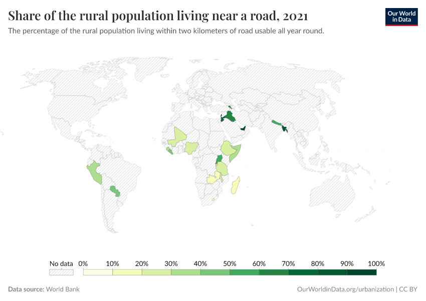 “Data Page: Share of the rural population living near a road”. Our World in Data (2025). Data adapted from World Bank. Retrieved from https://auto-epoch.owid.pages.dev:8789/20250909-093708/grapher/share-of-rural-population-near-a-road.html [online resource] (archived on September 9, 2025).How to cite this data