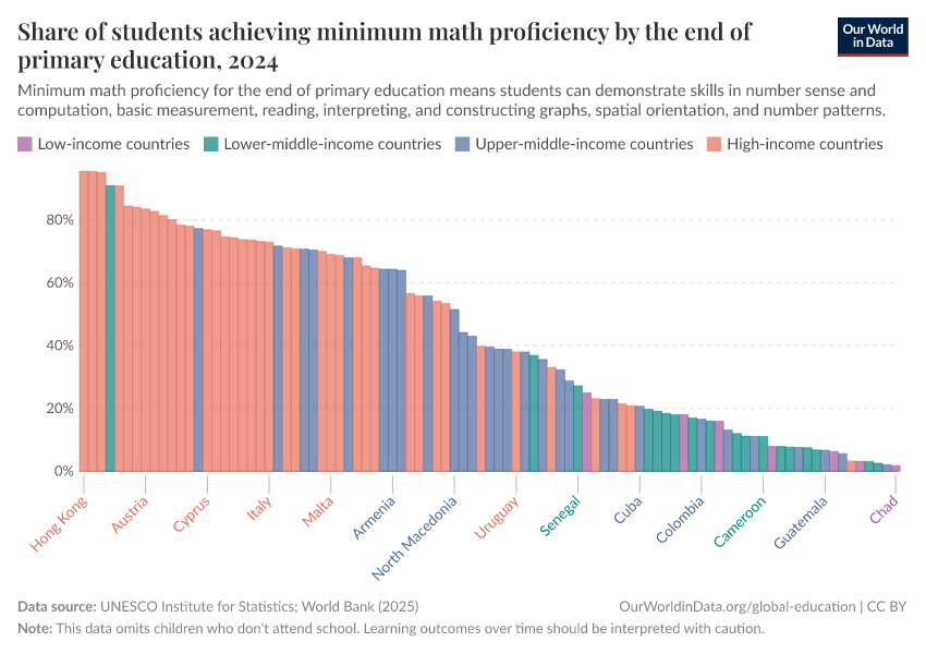 UNESCO Institute for Statistics – processed by Our World in Data. “Share of students achieving minimum math proficiency by the end of primary education” [dataset]. UNESCO Institute for Statistics, “Data from multiple sources” [original data]. Retrieved November 1, 2025 from https://auto-epoch.owid.pages.dev:8789/20250909-093708/grapher/share-of-students-at-end-of-primary-education-achieving-minimum-math-proficiency.html (archived on September 9, 2025).