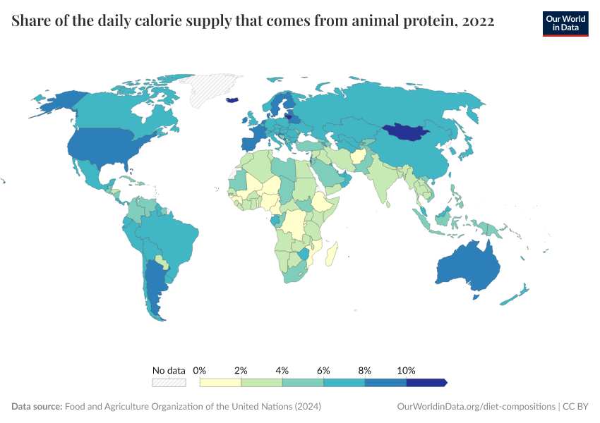 “Data Page: Share of the daily calorie supply that comes from animal protein”, part of the following publication: Hannah Ritchie, Pablo Rosado, and Max Roser (2023) - “Agricultural Production”. Data adapted from Food and Agriculture Organization of the United Nations. Retrieved from https://auto-epoch.owid.pages.dev:8789/20250925-235133/grapher/share-of-the-daily-calorie-supply-that-comes-from-animal-protein.html [online resource] (archived on September 25, 2025).How to cite this data