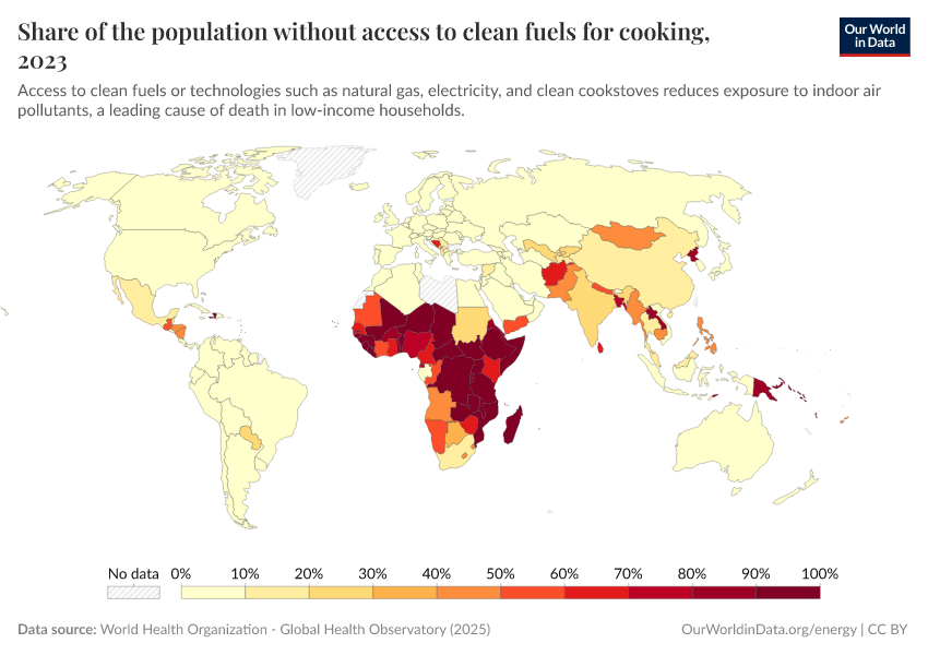 World Health Organization - Global Health Observatory (2025) – processed by Our World in Data. “Share of the population without access to clean fuels for cooking” [dataset]. World Health Organization, “Global Health Observatory” [original data]. Retrieved November 1, 2025 from https://auto-epoch.owid.pages.dev:8789/20250909-093708/grapher/share-of-the-population-without-access-to-clean-fuels-for-cooking.html (archived on September 9, 2025).