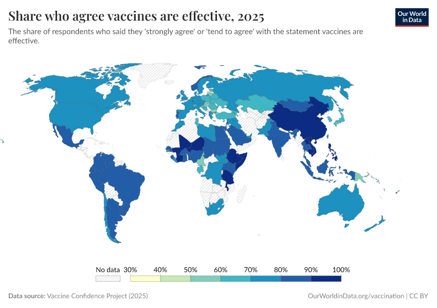 Vaccine Confidence Project (2025) – processed by Our World in Data. “Share who agree vaccines are effective” [dataset]. Vaccine Confidence Project, “Vaccine Confidence Index” [original data]. Retrieved November 1, 2025 from https://auto-epoch.owid.pages.dev:8789/20250909-093708/grapher/share-who-agree-vaccines-are-effective.html (archived on September 9, 2025).