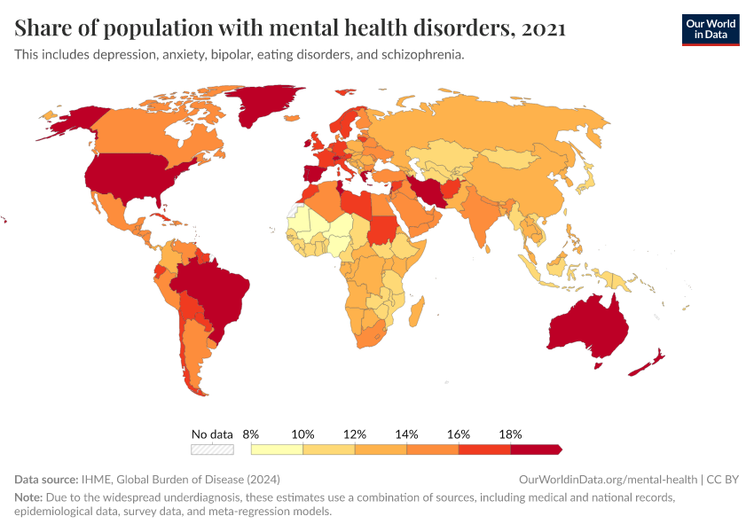 IHME, Global Burden of Disease (2024) – with major processing by Our World in Data. “Share of population with mental health disorders” [dataset]. IHME, Global Burden of Disease, “Global Burden of Disease - Prevalence and Incidence” [original data]. Retrieved November 1, 2025 from https://auto-epoch.owid.pages.dev:8789/20250909-093708/grapher/share-with-mental-and-substance-disorders.html (archived on September 9, 2025).