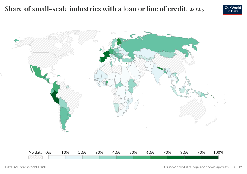 “Data Page: Share of small-scale industries with a loan or line of credit”. Our World in Data (2025). Data adapted from World Bank. Retrieved from https://auto-epoch.owid.pages.dev:8789/20250909-093708/grapher/smalsmall-scale-industries-loan.html [online resource] (archived on September 9, 2025).How to cite this data