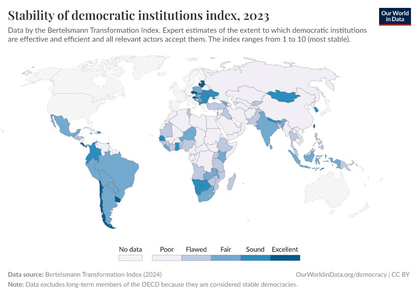 “Data Page: Stability of democratic institutions index”, part of the following publication: Bastian Herre, Lucas Rodés-Guirao, and Esteban Ortiz-Ospina (2013) - “Democracy”. Data adapted from Bertelsmann Transformation Index. Retrieved from https://auto-epoch.owid.pages.dev:8789/20250909-093708/grapher/stability-democratic-institutions-index-bti.html [online resource] (archived on September 9, 2025).How to cite this data