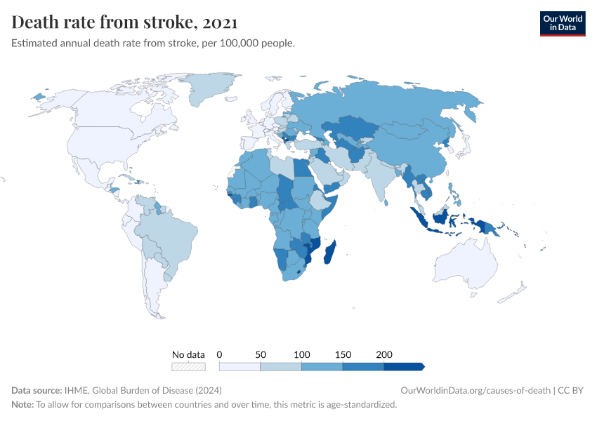 IHME, Global Burden of Disease (2024) – with minor processing by Our World in Data. “Death rate from stroke” [dataset]. IHME, Global Burden of Disease, “Global Burden of Disease - Deaths and DALYs” [original data]. Retrieved November 1, 2025 from https://auto-epoch.owid.pages.dev:8789/20250909-093708/grapher/stroke-death-rates.html (archived on September 9, 2025).