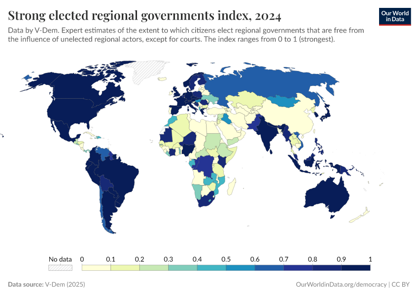 “Data Page: Elected regional governments”, part of the following publication: Bastian Herre, Lucas Rodés-Guirao, and Esteban Ortiz-Ospina (2013) - “Democracy”. Data adapted from V-Dem. Retrieved from https://auto-epoch.owid.pages.dev:8789/20250925-233948/grapher/strong-elected-regional-governments-index.html [online resource] (archived on September 25, 2025).How to cite this data
